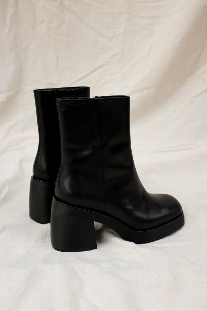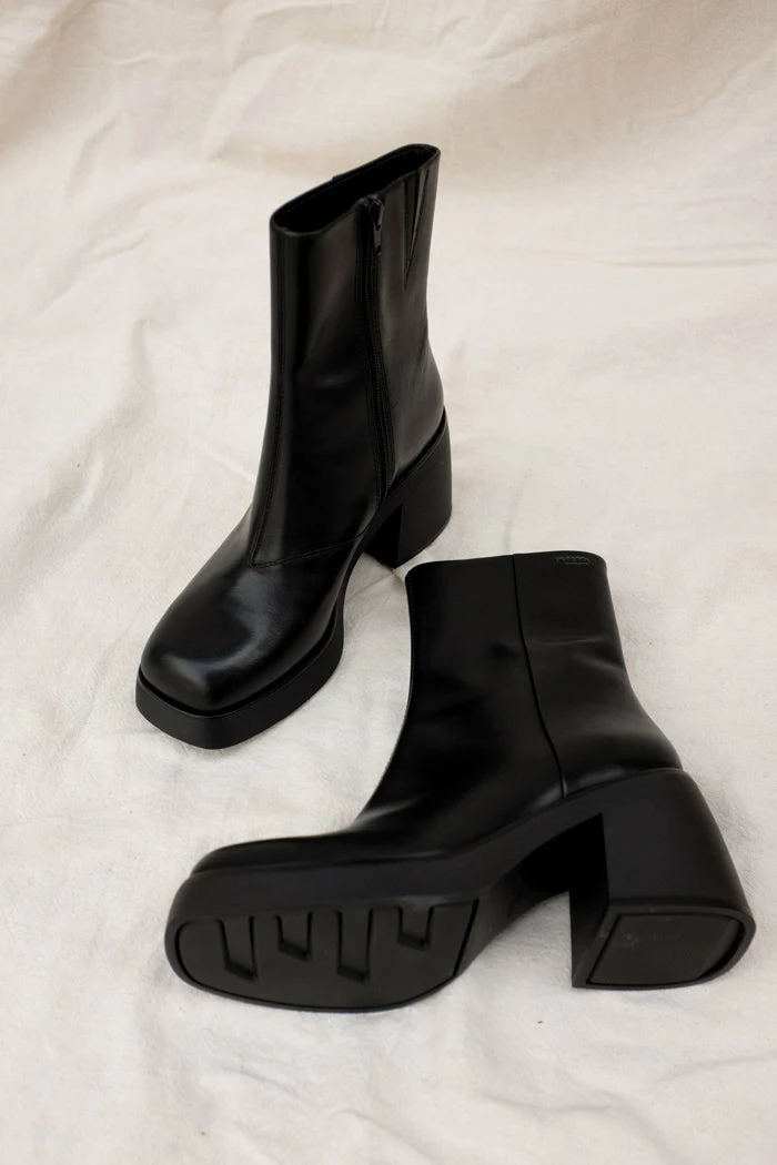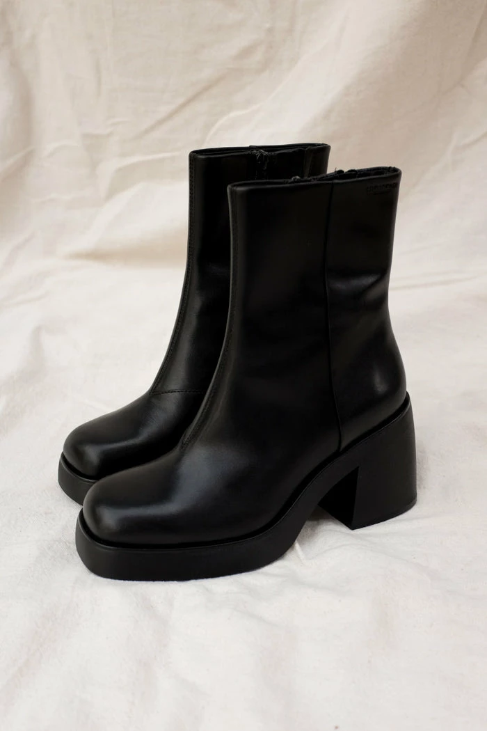 Vagabond Brooke chunky boots. These towering platform boots bring character to any individual style, anywhere. The ankle-high design is crafted from smooth black leather completed with square toes. The minimalist upper is paired with solid 87mm heels and balanced by thick platform soles, creating a chunky silhouette.