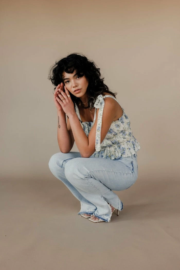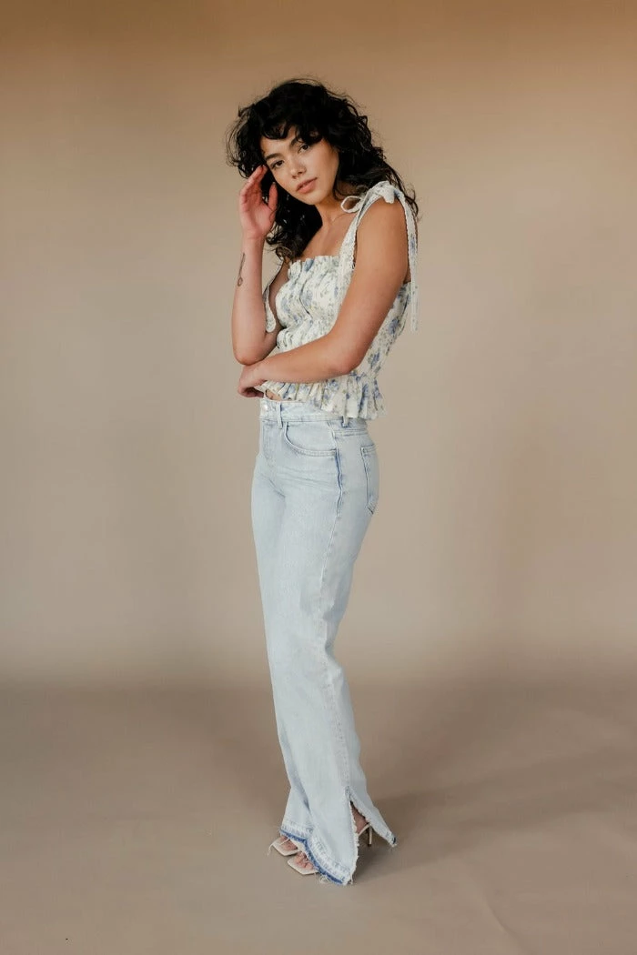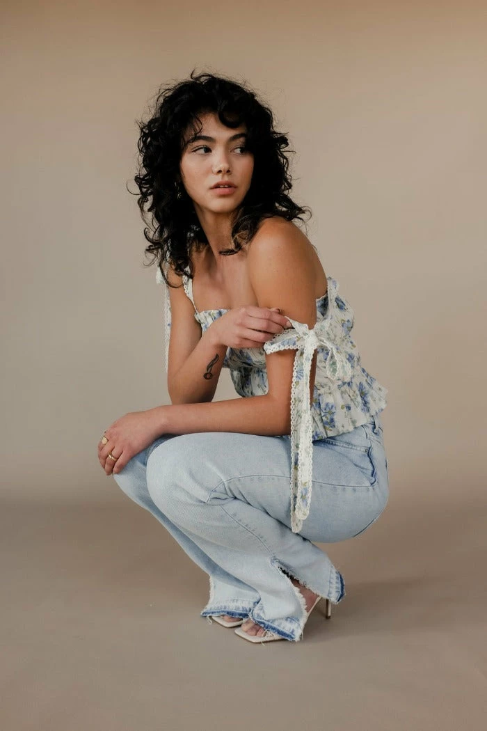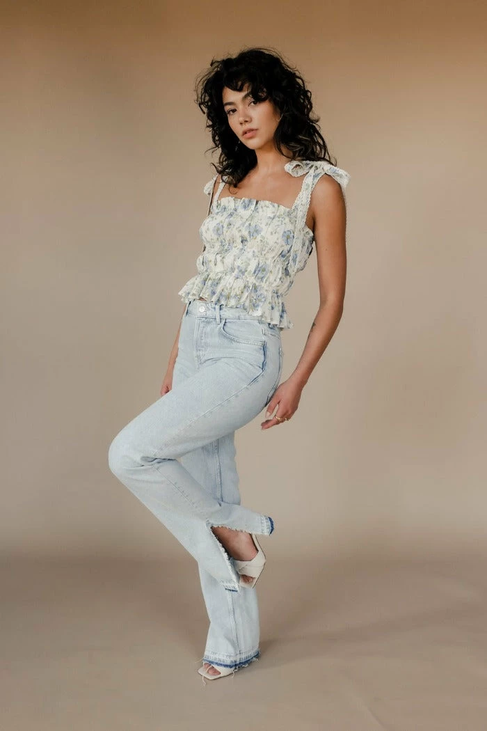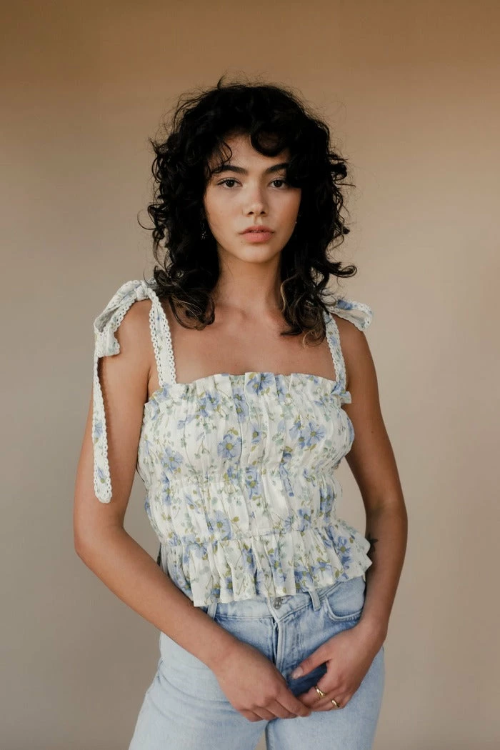 Winston White Marjorie Top in floral Pewter Petal. Features a custom print, intricate lace trim on tie straps, elastic under bust and at waist with a ruffle edge.