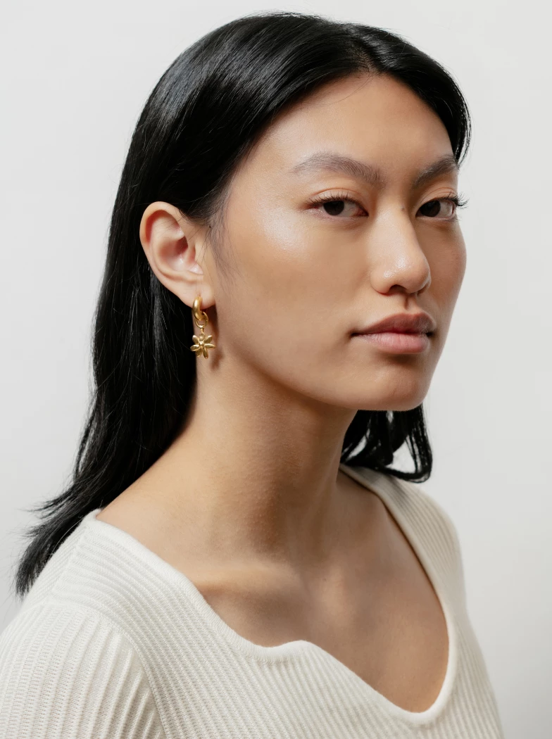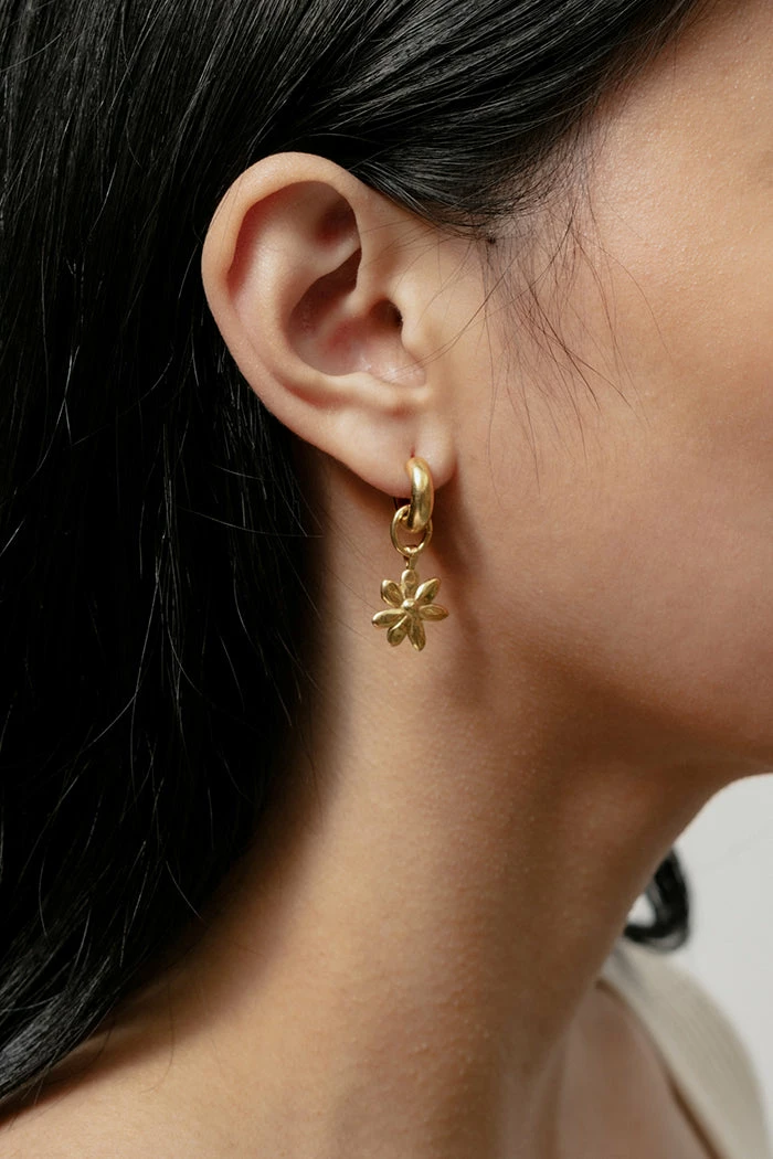 14k gold plated over bronze hoop and flower charm drop . 14k gold plated sterling silver posts. Charm 34mm long