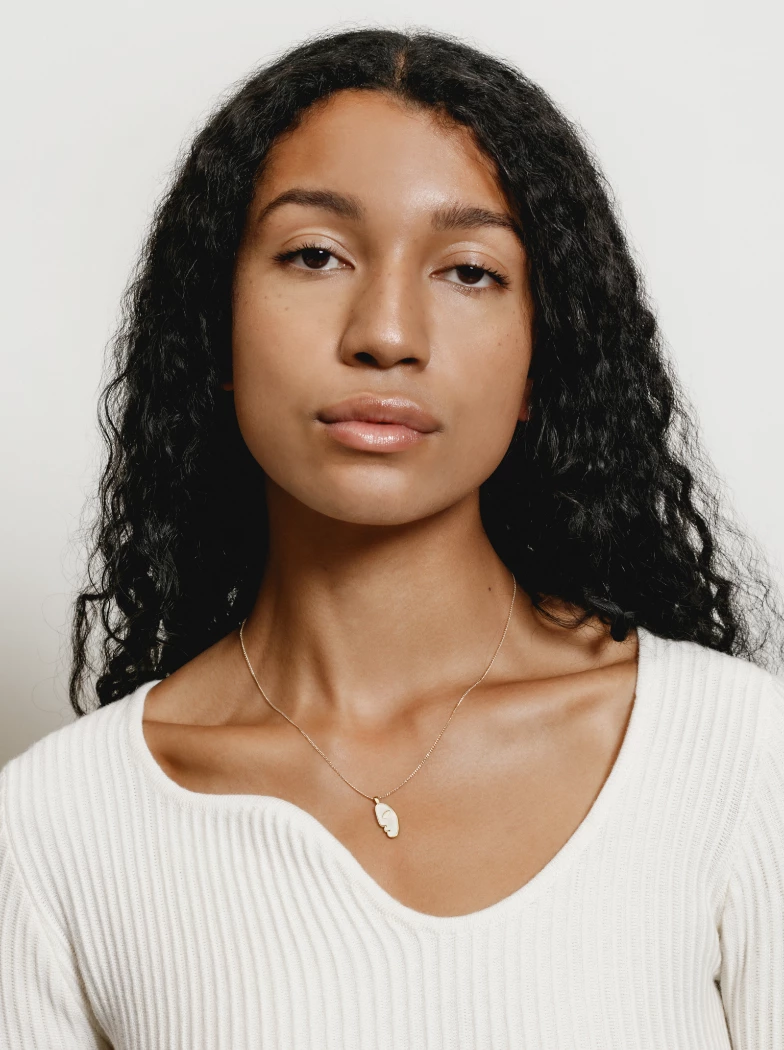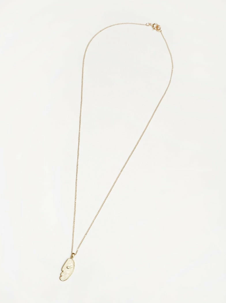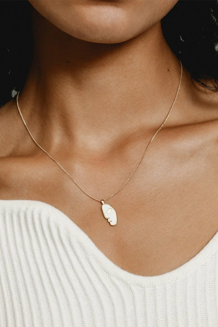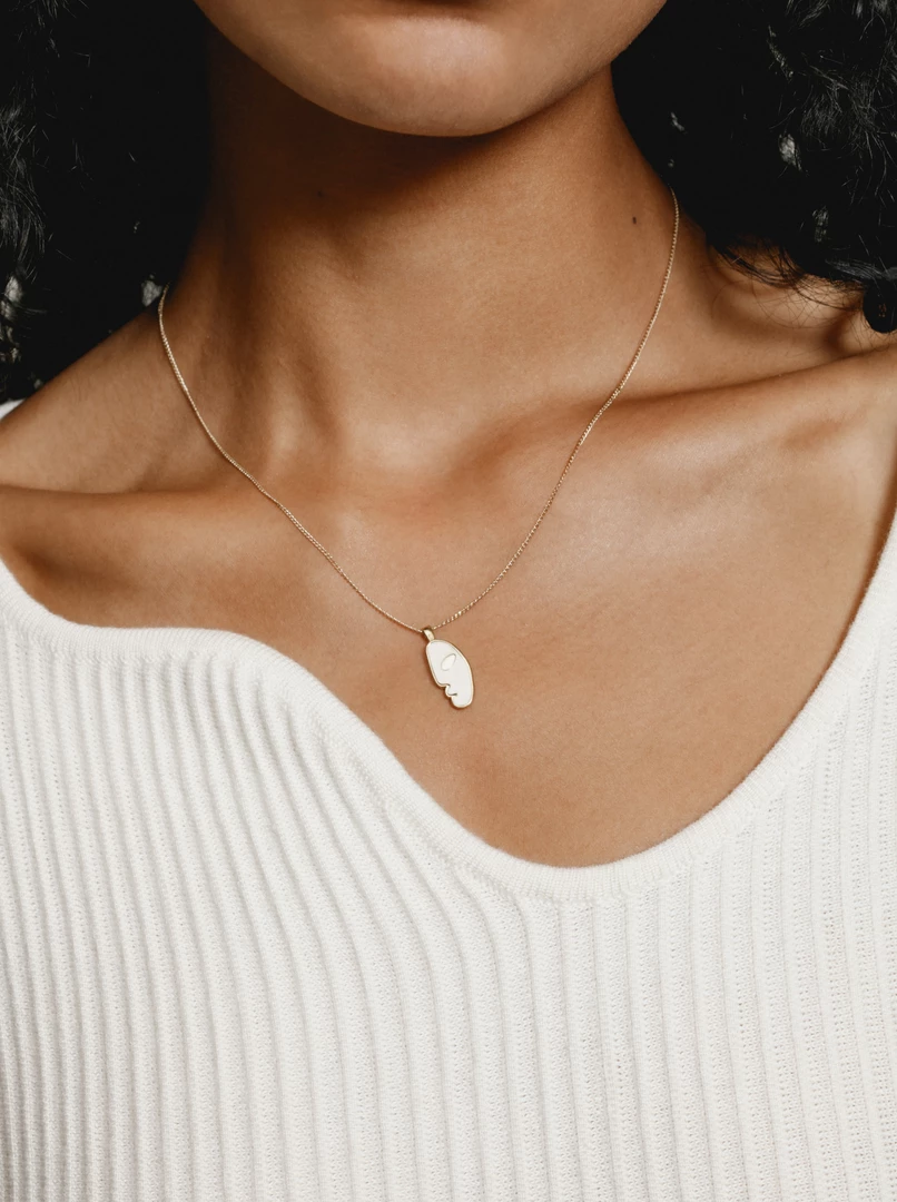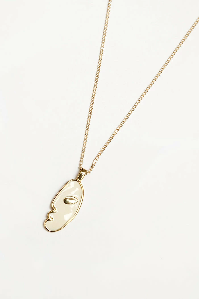 Wolf Circus Fiona face necklace in creme and gold. “Duality” Playing with the light and dark, contrast. One cannot exist without the other.