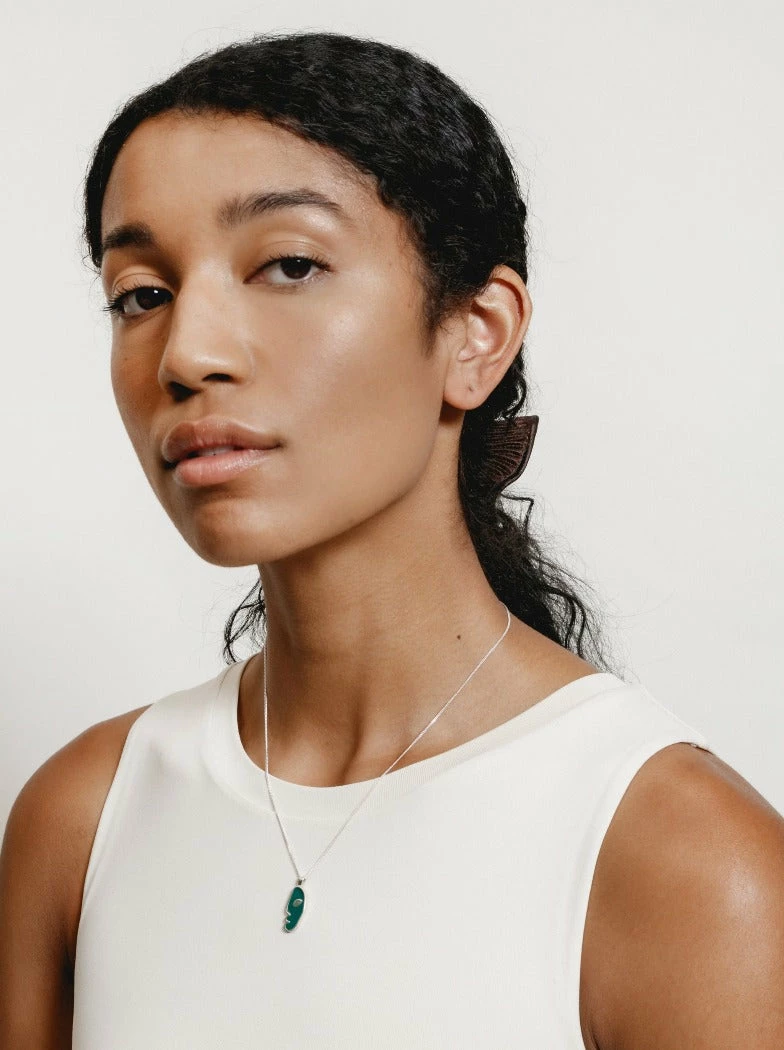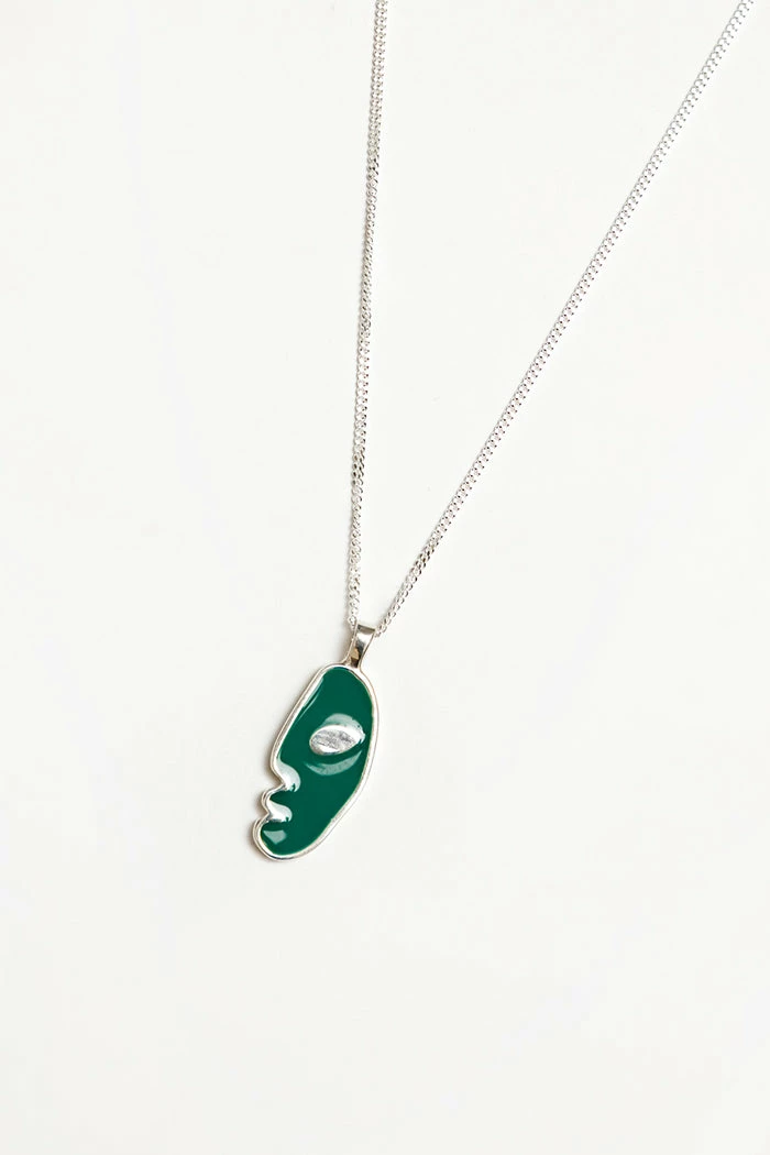 Wolf Circus Fiona face necklace in green and sterling silver. “Duality” Playing with the light and dark, contrast. One cannot exist without the other.