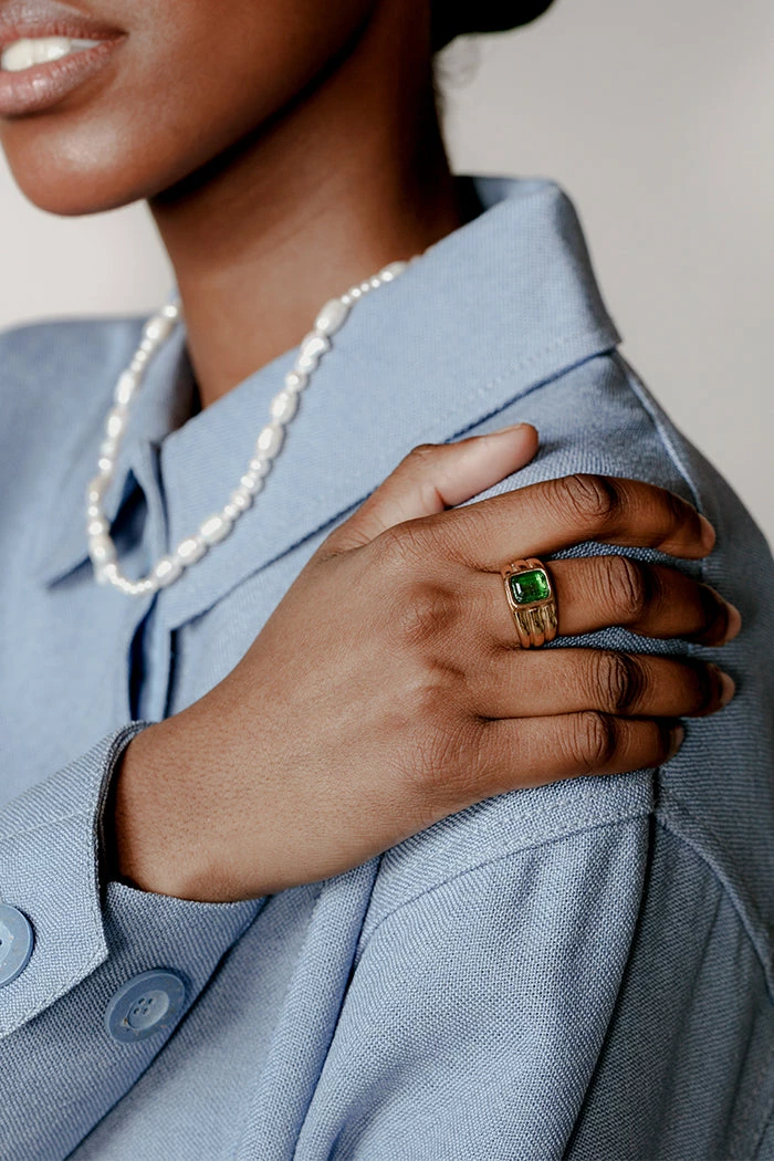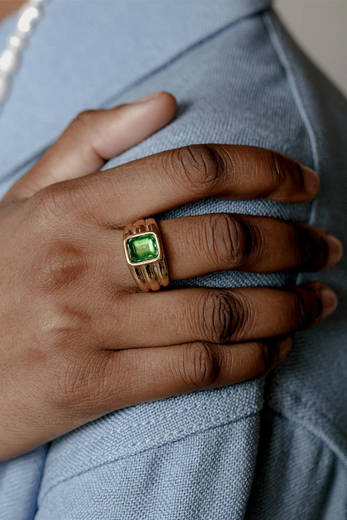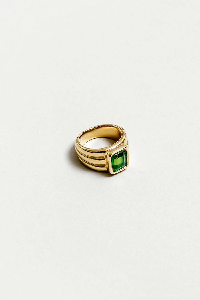 Wolf Circus Penelope Peridot green stone rectangle ring on thick band.Â
