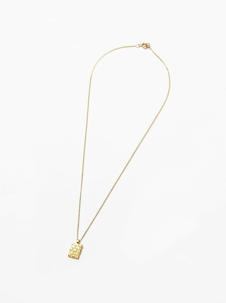 Wolf Circus Penny rectangular checkered pendant necklace with cream and gold checkered pattern.