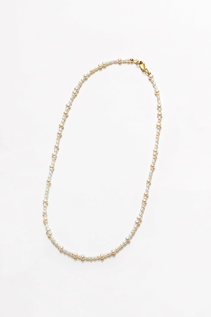 Small freshwater pearl necklace with gold-filled lobster clasp. Available in 16” and 18”