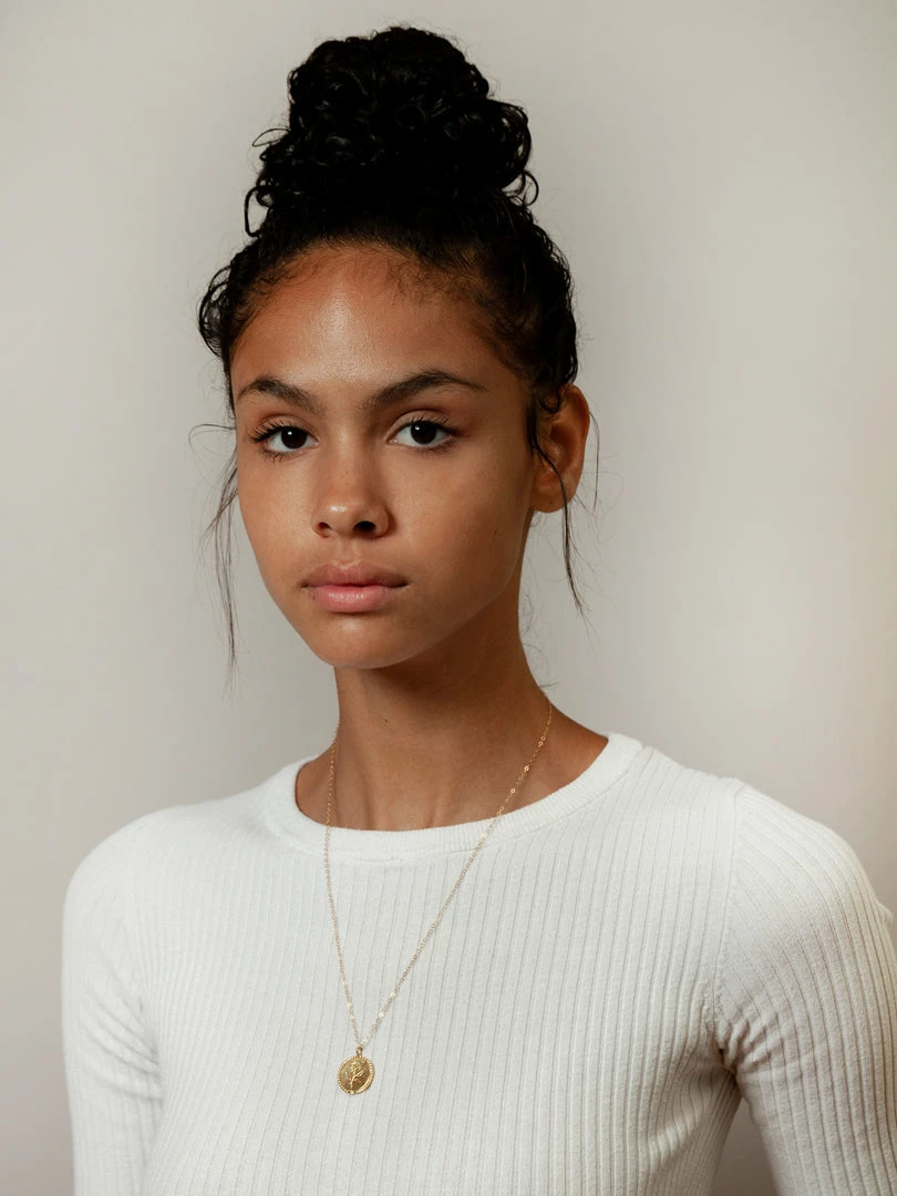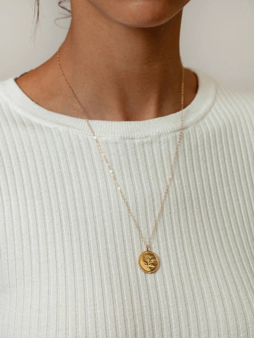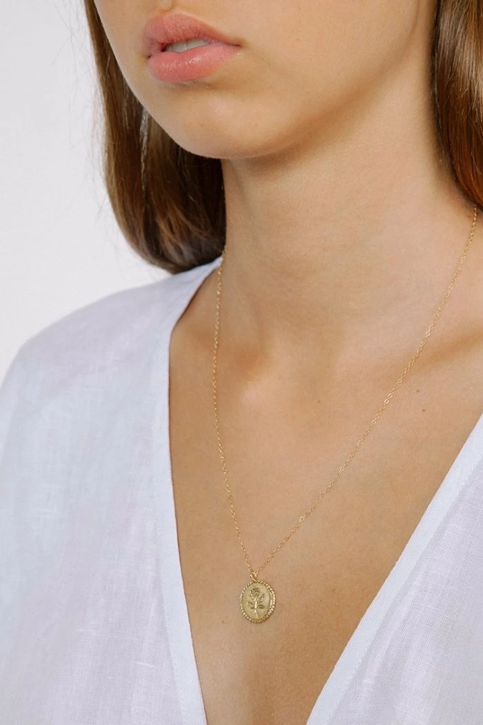 Wolf Circus engraved Rose Coin necklace 14k gold.