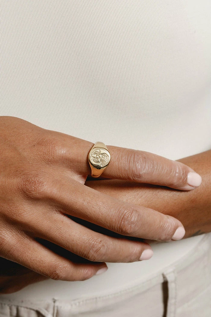 Wolf Circus Tori signet ring in gold. “Contortionist” You’ll be surprised how easily we can bend when we’re faced with the unexpected.